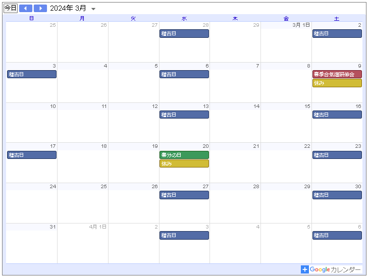 3月9日(土)と20日(祝・水)は休みです。それ以外は通常通りの稽古となります。