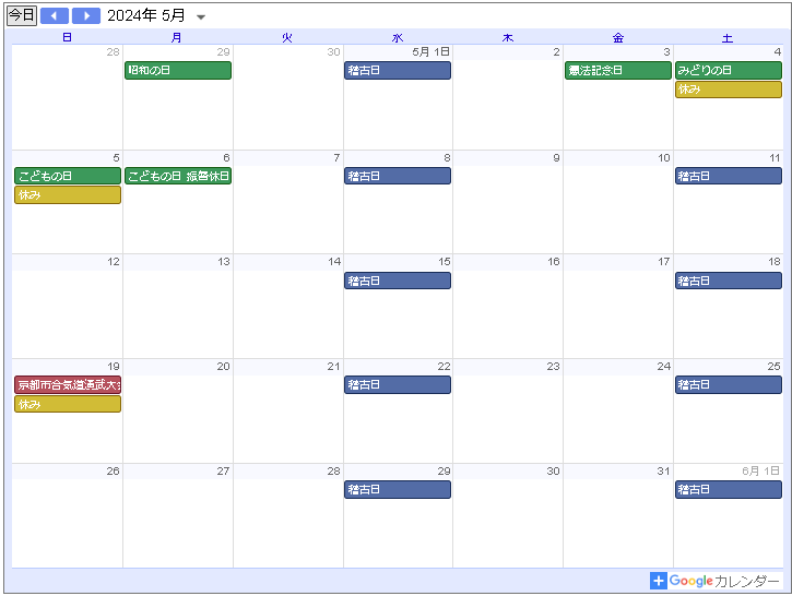 GWの5月4日(土)・5日(日)および19日(日)は休みです。