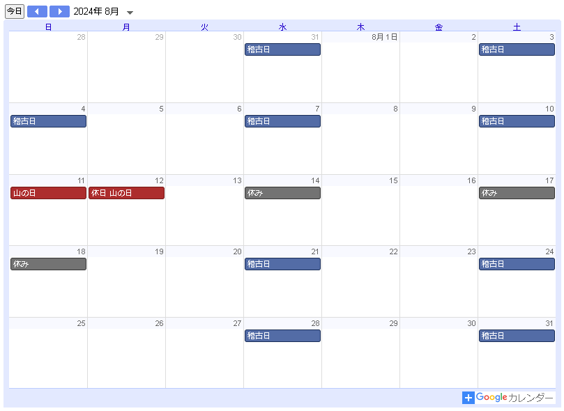 8月14日(水)・17日(土)および18日(日)は休みです。
