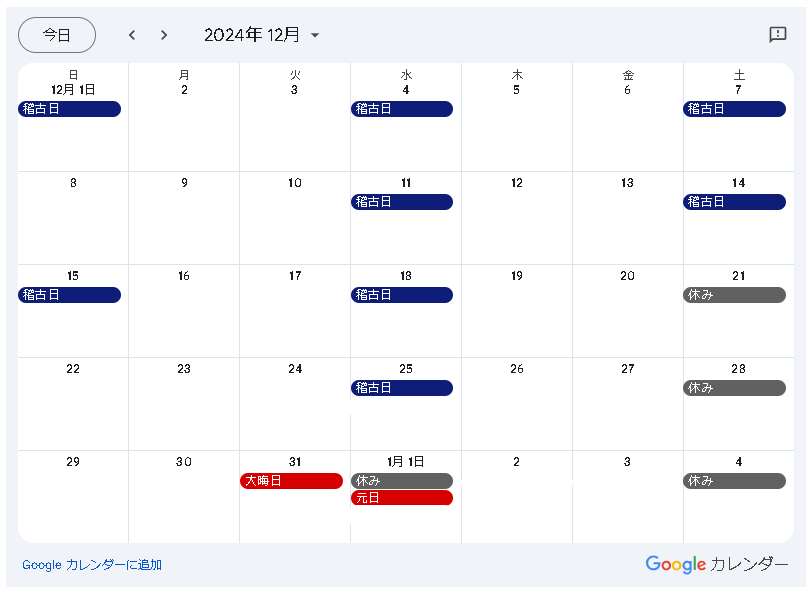 12月21日(土)は休みです。28日(土)から年末年始の休みに入ります。稽古納めは12月25日(水)、稽古始めは1月8日(水)となります。