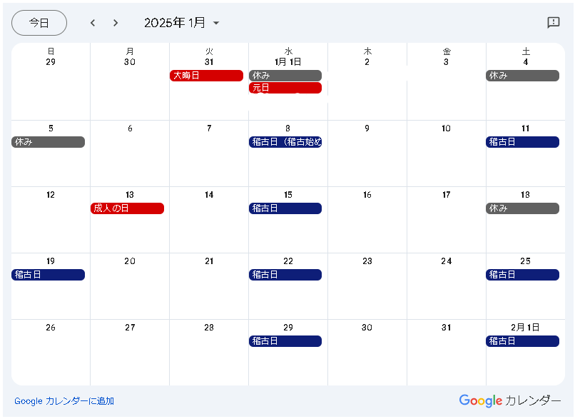 12月28日から1月5日まで年末年始の休み、1月18日(土)も休みです。稽古初めは1月8日(水)となります。