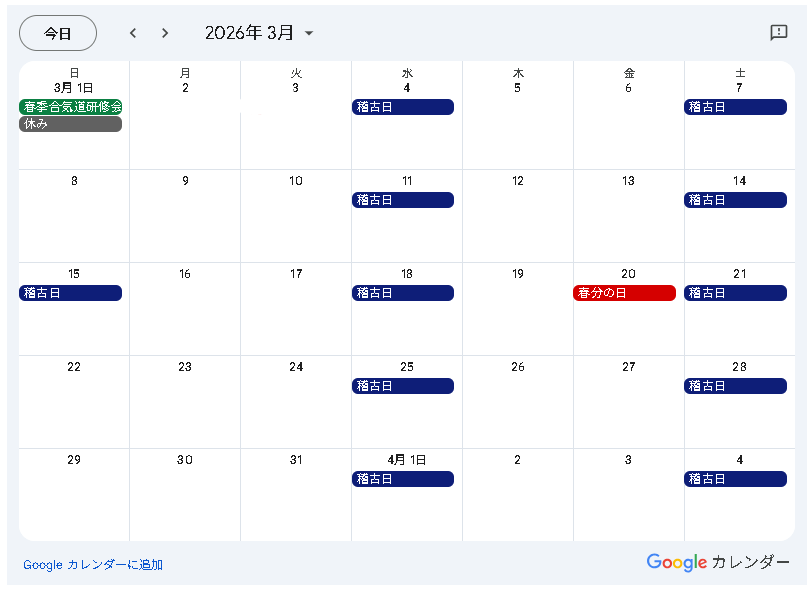 3月1日(日)は休みです。それ以外は通常通りの稽古となります。