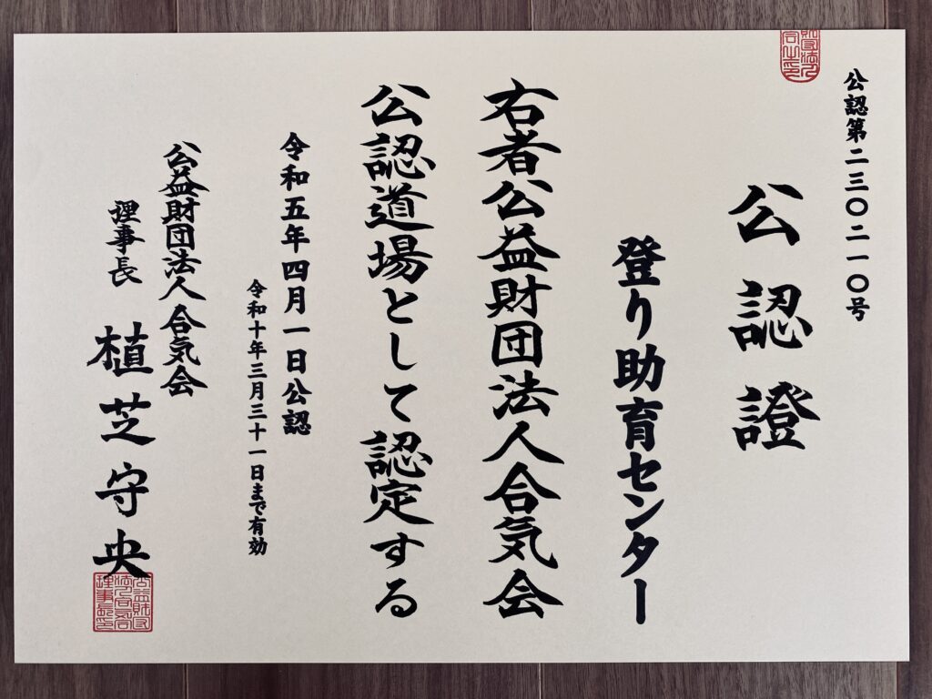 当道場は公益財団法人合気会より公認をいただいております。