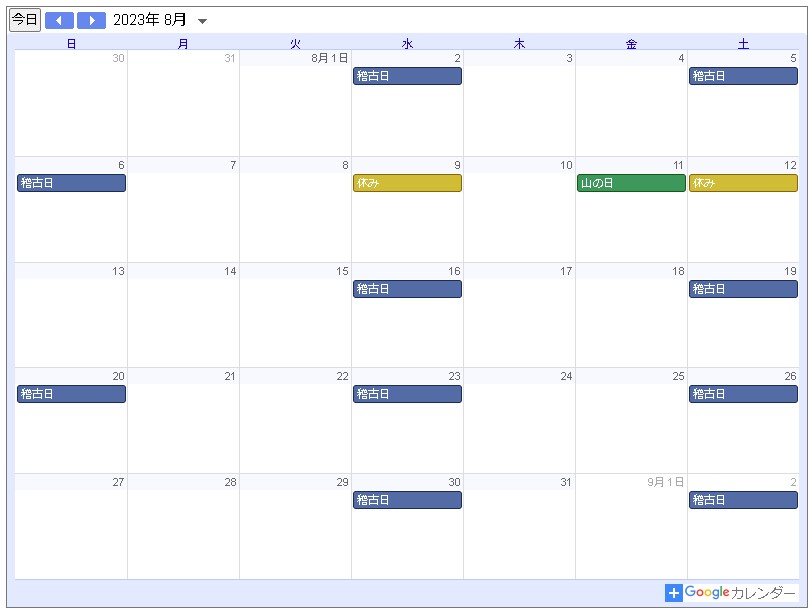 8月の予定表を更新しました。8月9(水)と12日(土)はお盆で休みますが、それ以外は通常通りの稽古となります。